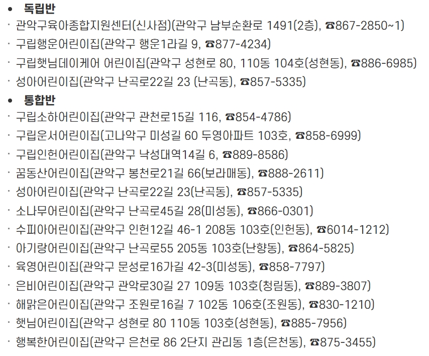 | 독립반 | 관악구육아종합지원센터 | 남부순환로 1491 (2층) | 02-867-2850~1 |