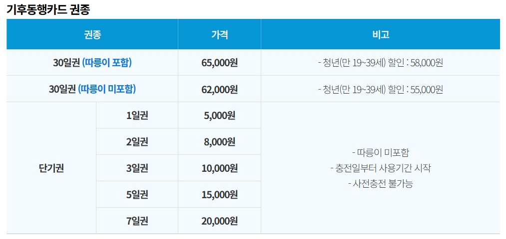 6만 2000원 카드 구매시 무제한 이용 (따릉이 포함 6만 5000원) |