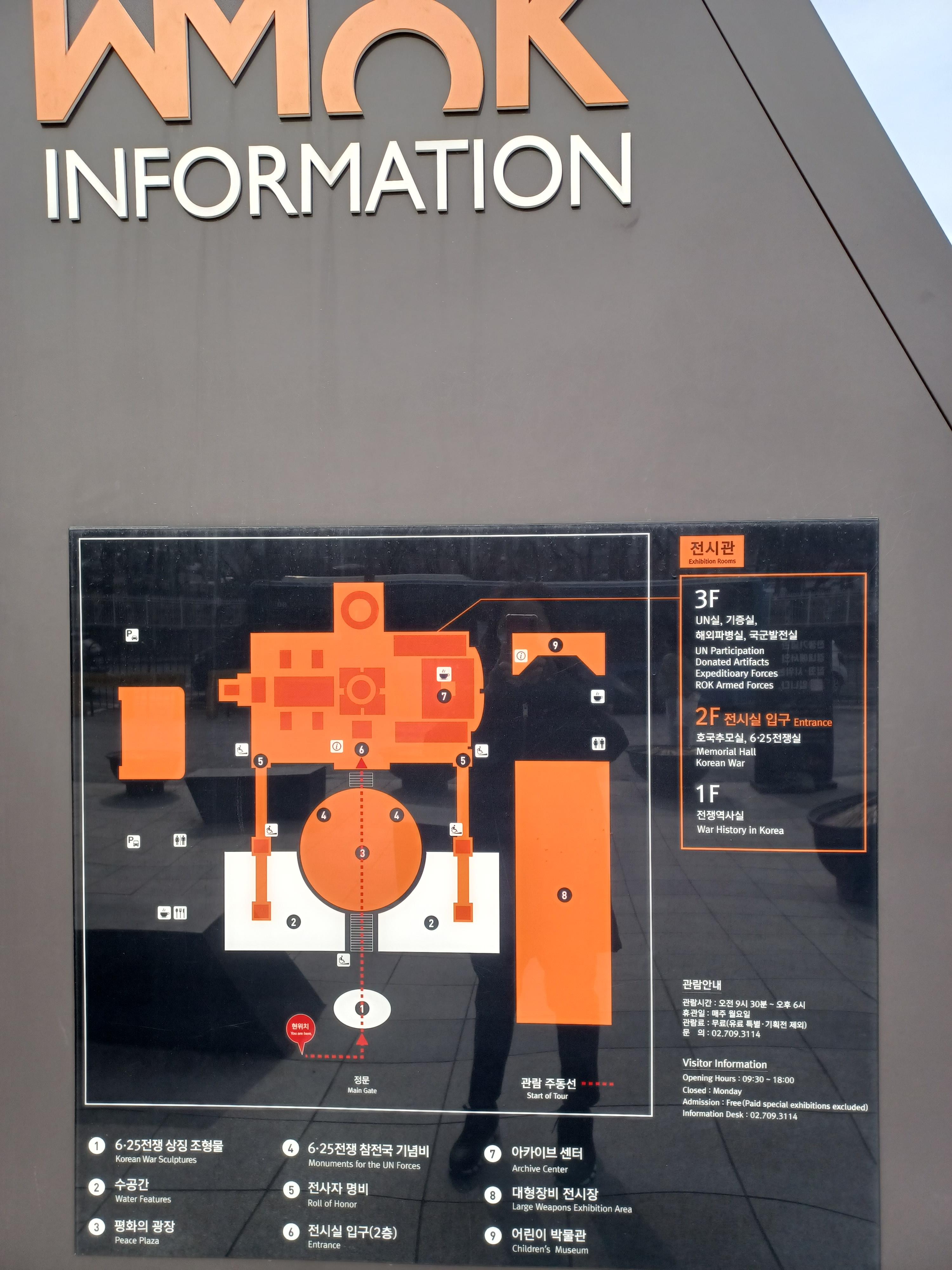 WMOK (Warm Memorial of Korea)의 이니셜을 딴 조형물이 건물 앞에 있으며, 전시관 안쪽 구조 도안과 설명이 옆에 있습니다.