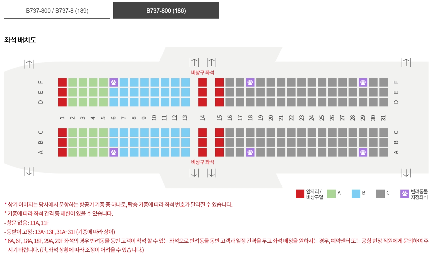 - 보잉 737-800 : 일반적으로 186석 또는 189석으로 구성되어 있어요.