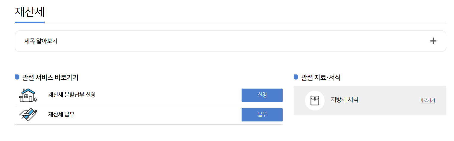 재산세에 들어오면 분할 납부 신청과 바로 납부가 가능하며, 관련 서식도 다운로드 받으실 수 있습니다.