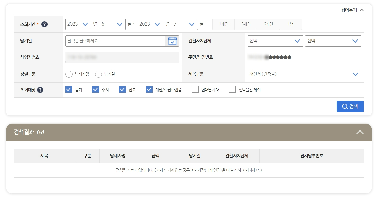 세금 납부 조회기간, 납기일, 사업자번호, 관할자치단체, 주민번호, 세목 등을 확인하시어 납부하시면 됩니다.