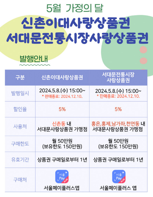 | 5.8.(수) | 15:00 | 신촌이대* 사랑상품권 | 30 억원 |