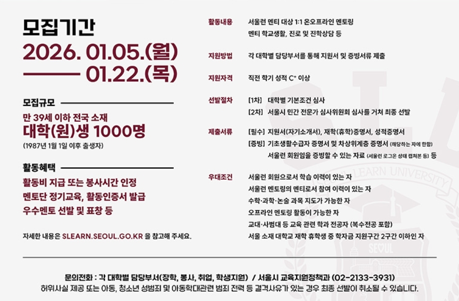 📢 서울시가 미래 인재 양성을 위해 ‘서울런 멘토단’ 1,000명을 모집합니다! 대학생이라면 장학금과 활동비, 인증서까지 받을 수 있는 절호의 기회🎓 단, 1월 22일까지 접수 마감이니 지금 바로 확인해 보세요!